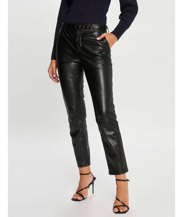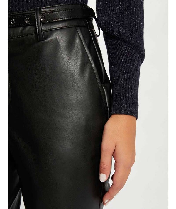 - GETAILLEERDE IMITATIELEREN 7/8 BROEK, STANDAARD MAAT, AANSLUITENDE SNIT, RITS- EN KNOOPSLUITING AAN DE VOORZIJDE, 2 SCHUINE ZAKKEN AAN DE VOORZIJDE, 2 PASPELZAKKEN AAN DE ACHTERZIJDE, RIEMLUSSEN IN DE TAILLE, RIEM MET GESP, HET LIJKT OP LEER, 7/8E BENEN, HET MODEL IS 175 CM GROOT EN DRAAGT MAAT S/36, MAATADVIES: KIES UW GEBRUIKELIJKE MAAT