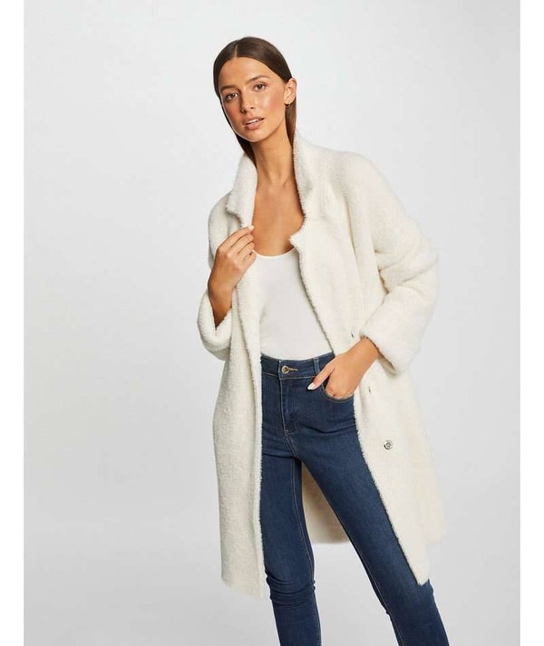 - LANG RECHT GEBREID DONSVEST, LANGE RECHTE PASVORM, REVERSKRAAG MET INKEPING, LANGE MOUWEN, KNOOPSLUITING AAN DE VOORKANT, MEDIUM TRICOT, WOLTRICOT, HET MODEL IS 175 CM GROOT EN DRAAGT MAAT S/36, MAATADVIES: KIES UW GEBRUIKELIJKE MAAT
