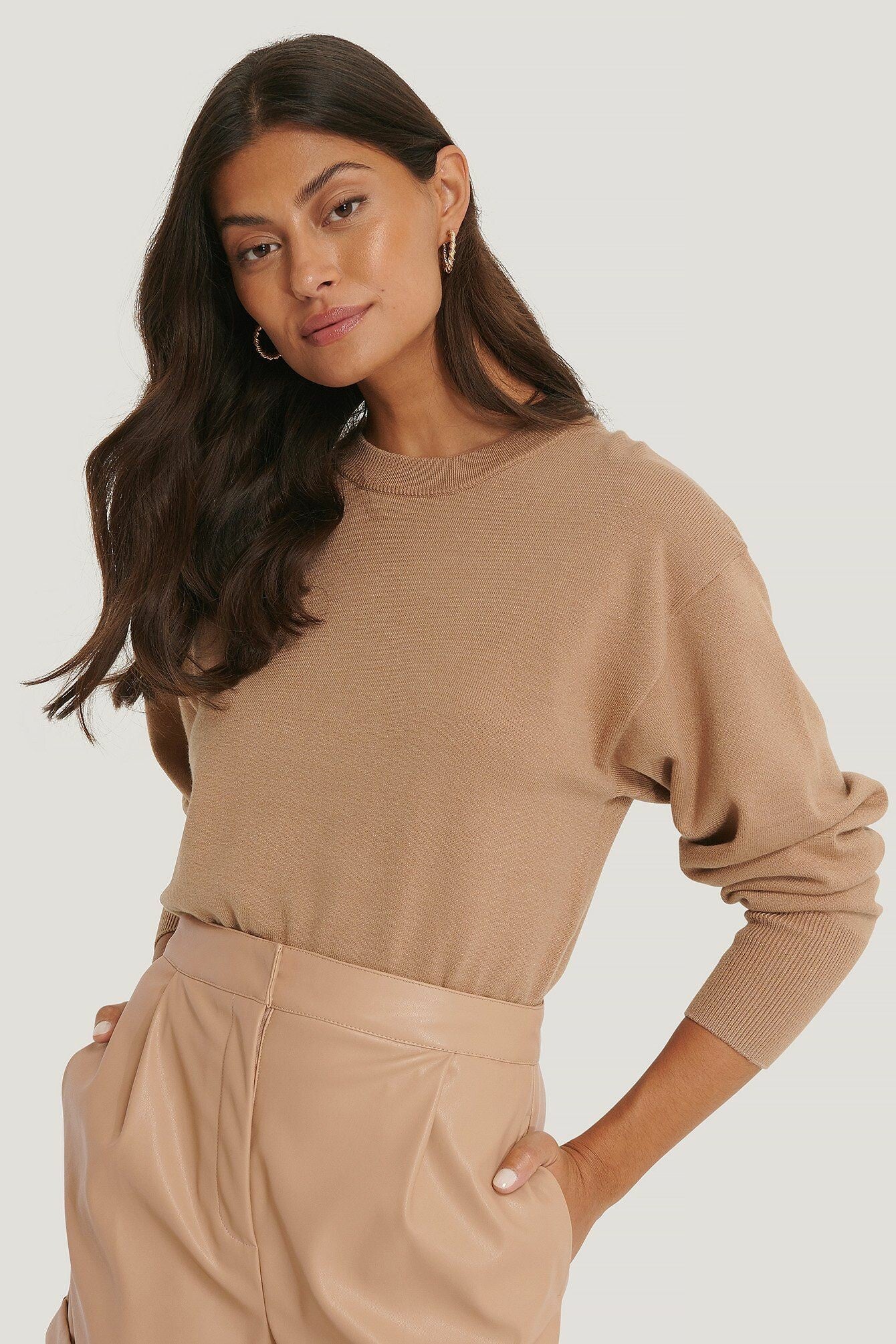This sweater features a ribbed rounded neckline, wide long sleeves with ribbed cuffs, a soft knit material and a larger ribbed hem.