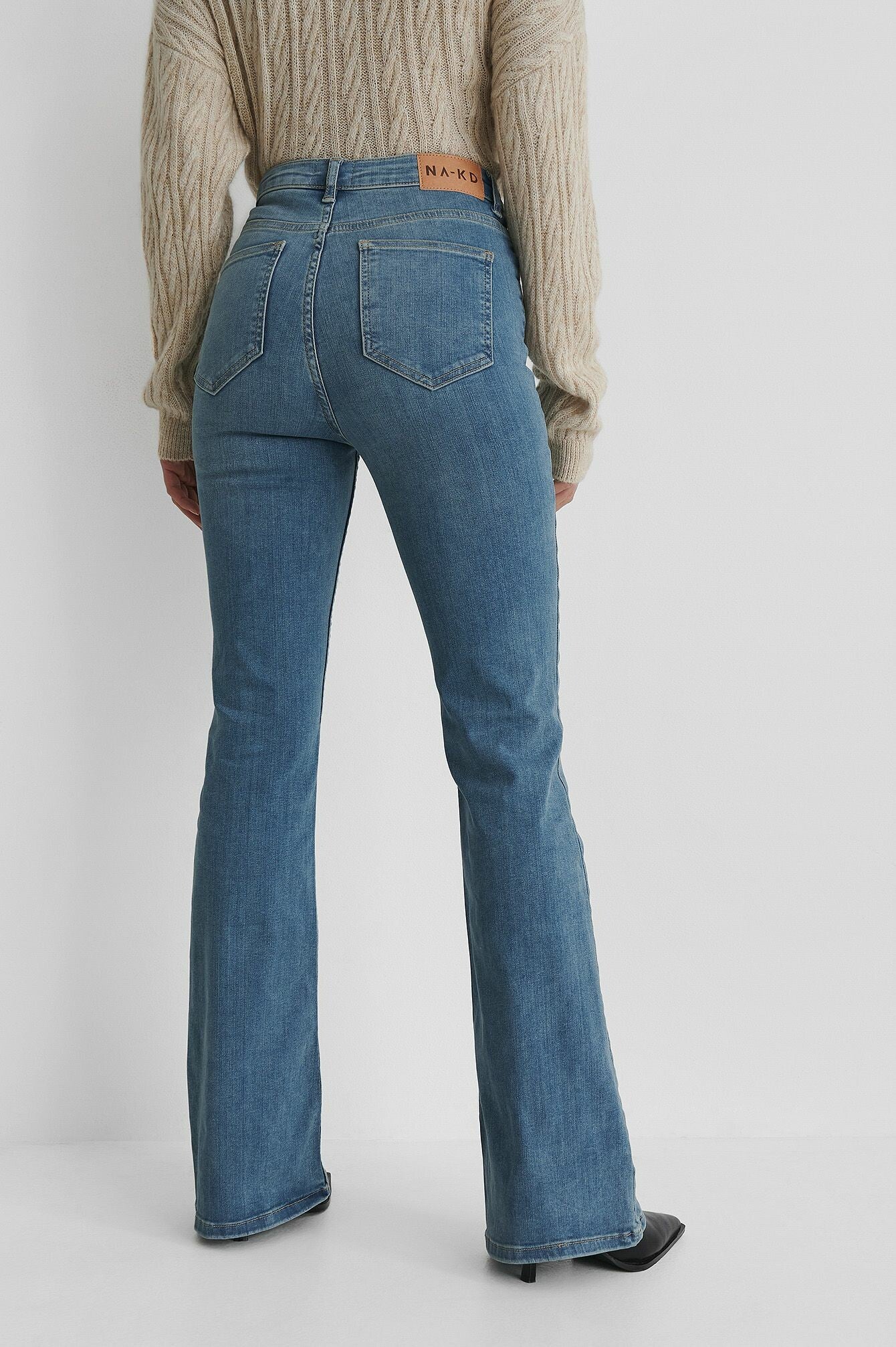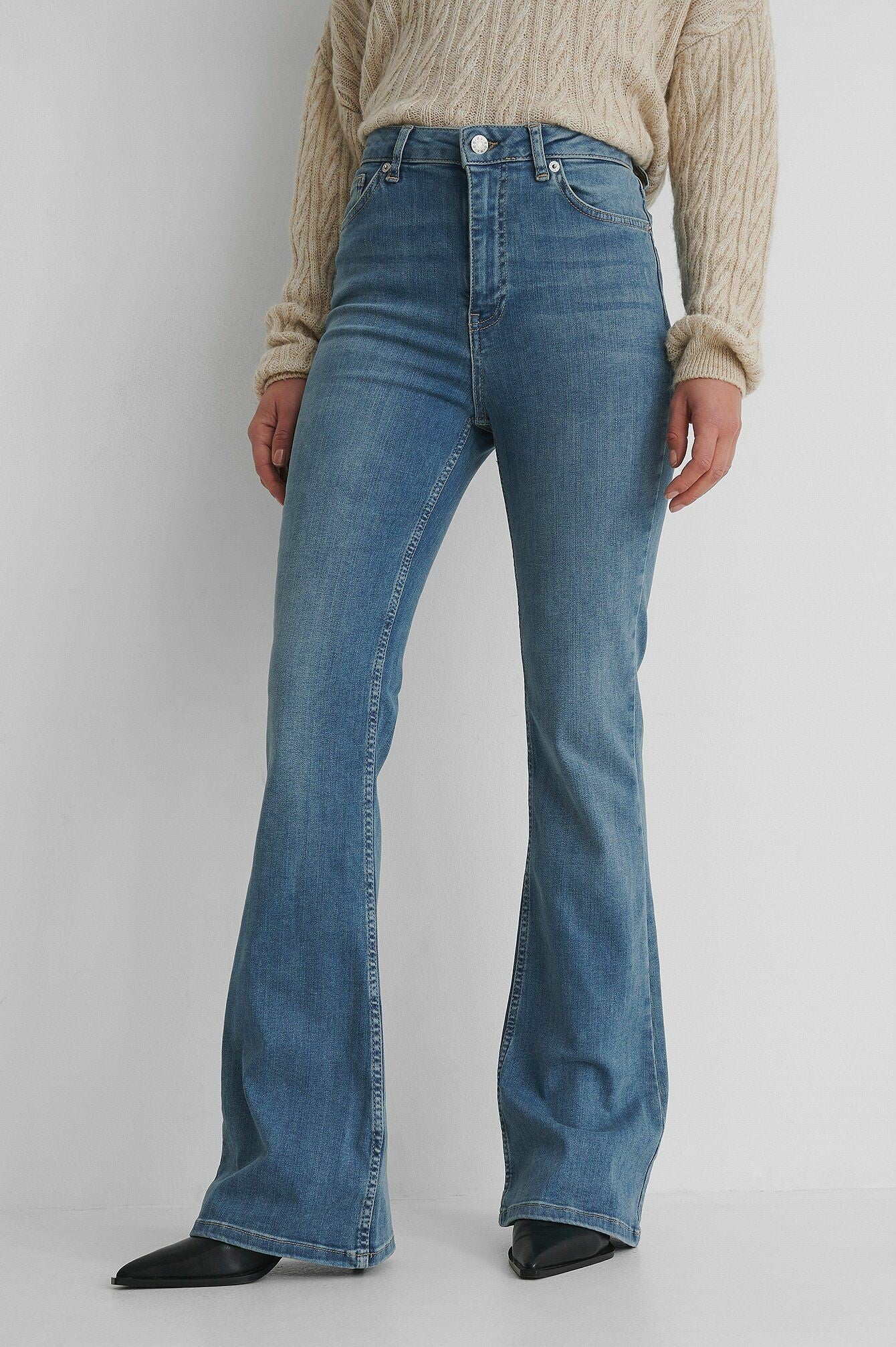 These jeans feature a high waist, a five-pocket design, flared legs, a skinny fit and a stretchy material.