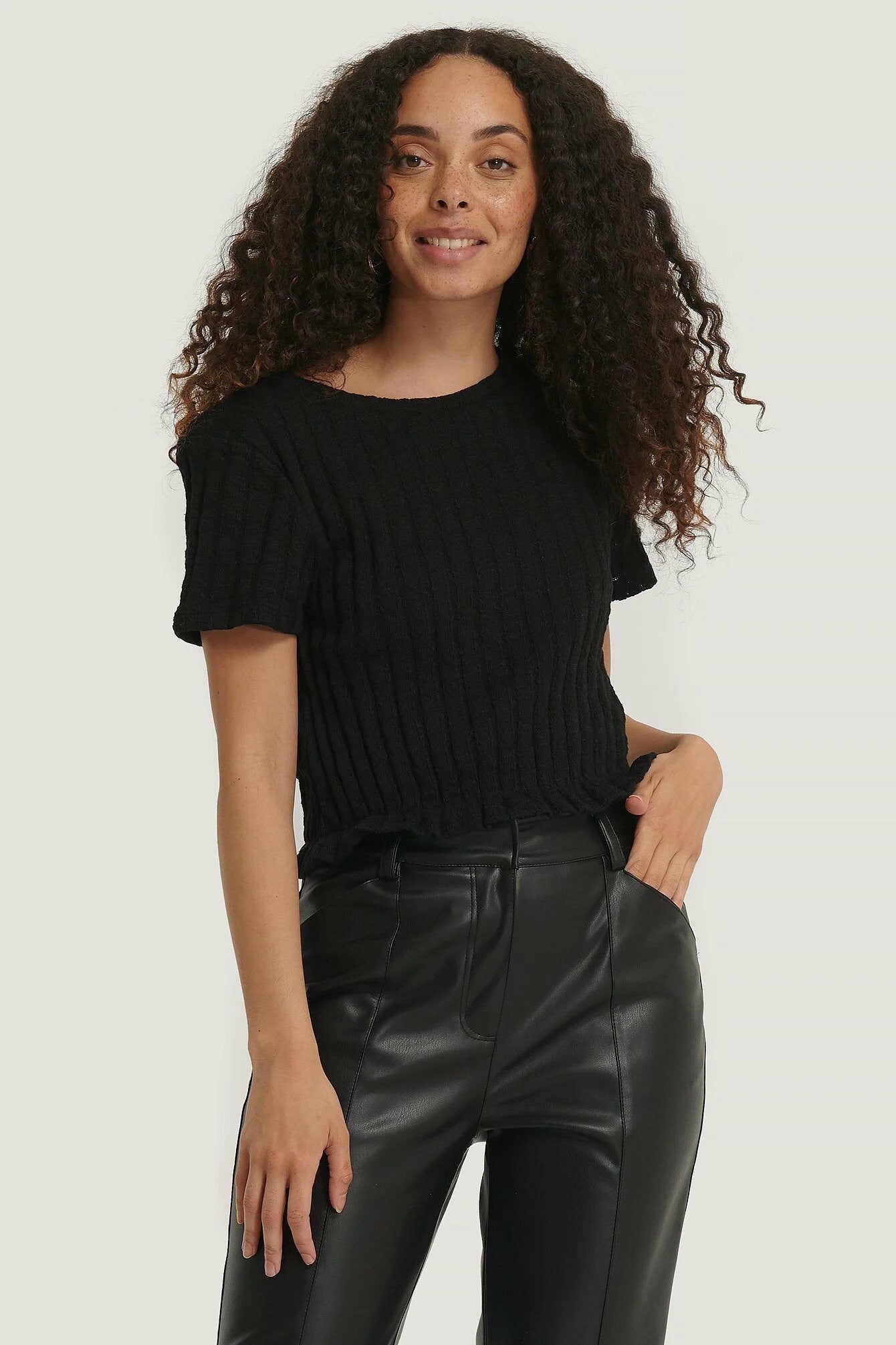 This top features a ribbed round neck, flounced details at the front, seethrough knit details, ribbed cuffs, a ribbed hem, a stretchy material and a slim fit.