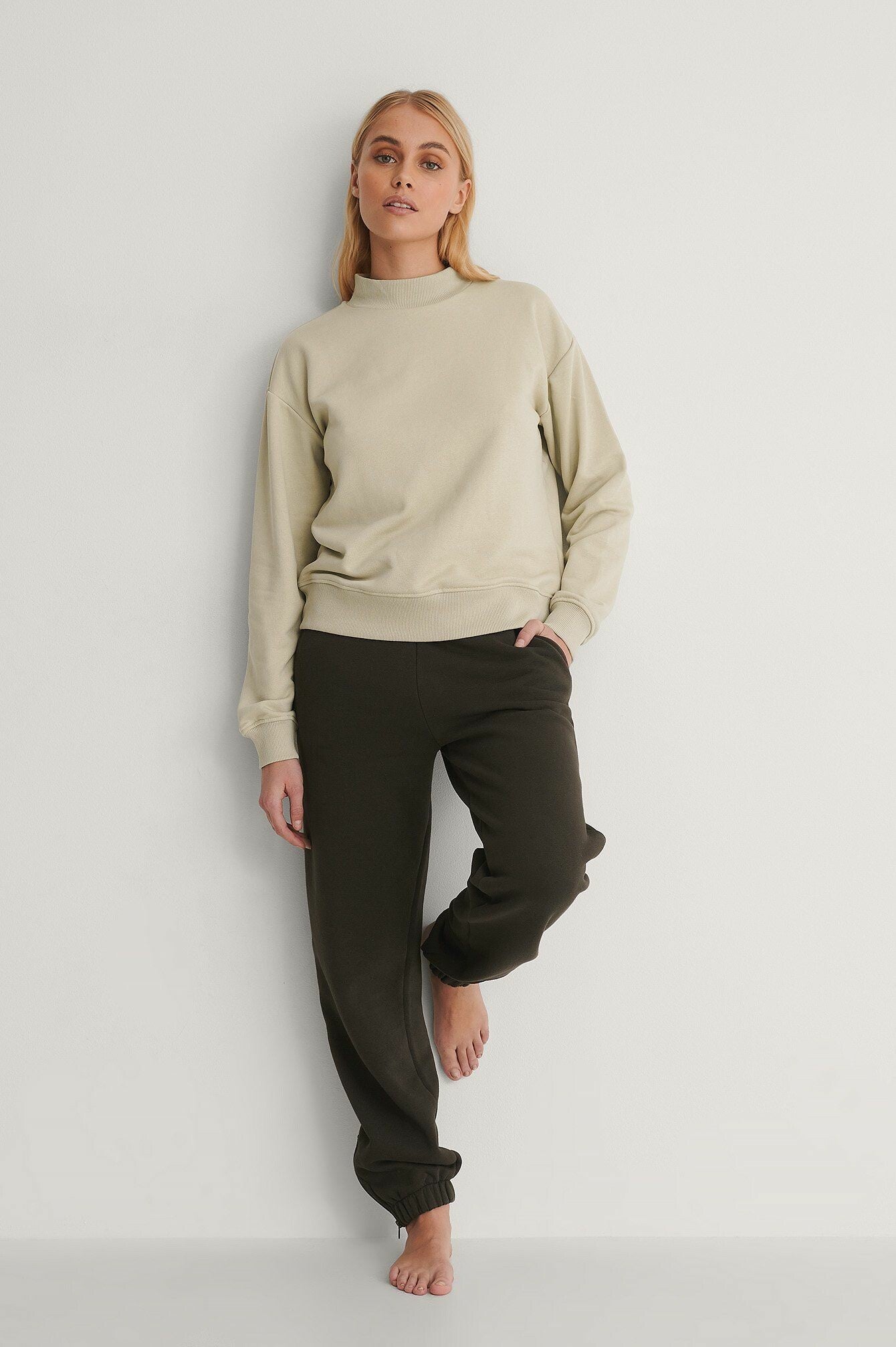 Dit sweatshirt heeft een geribbelde hoge hals, lange mouwen met geribde manchetten, een rechte, comfortabele pasvorm met een geribde zoom onderaan en een normale lengte.