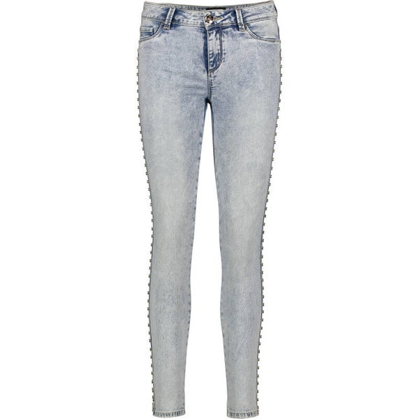 Jegging jeans in light indigo stretch cotton denim with studs embellishing the sides and used-effect wash. Featuring a very tight-fitting cut with regular waist and skinny leg. Button and concealed zip closure.