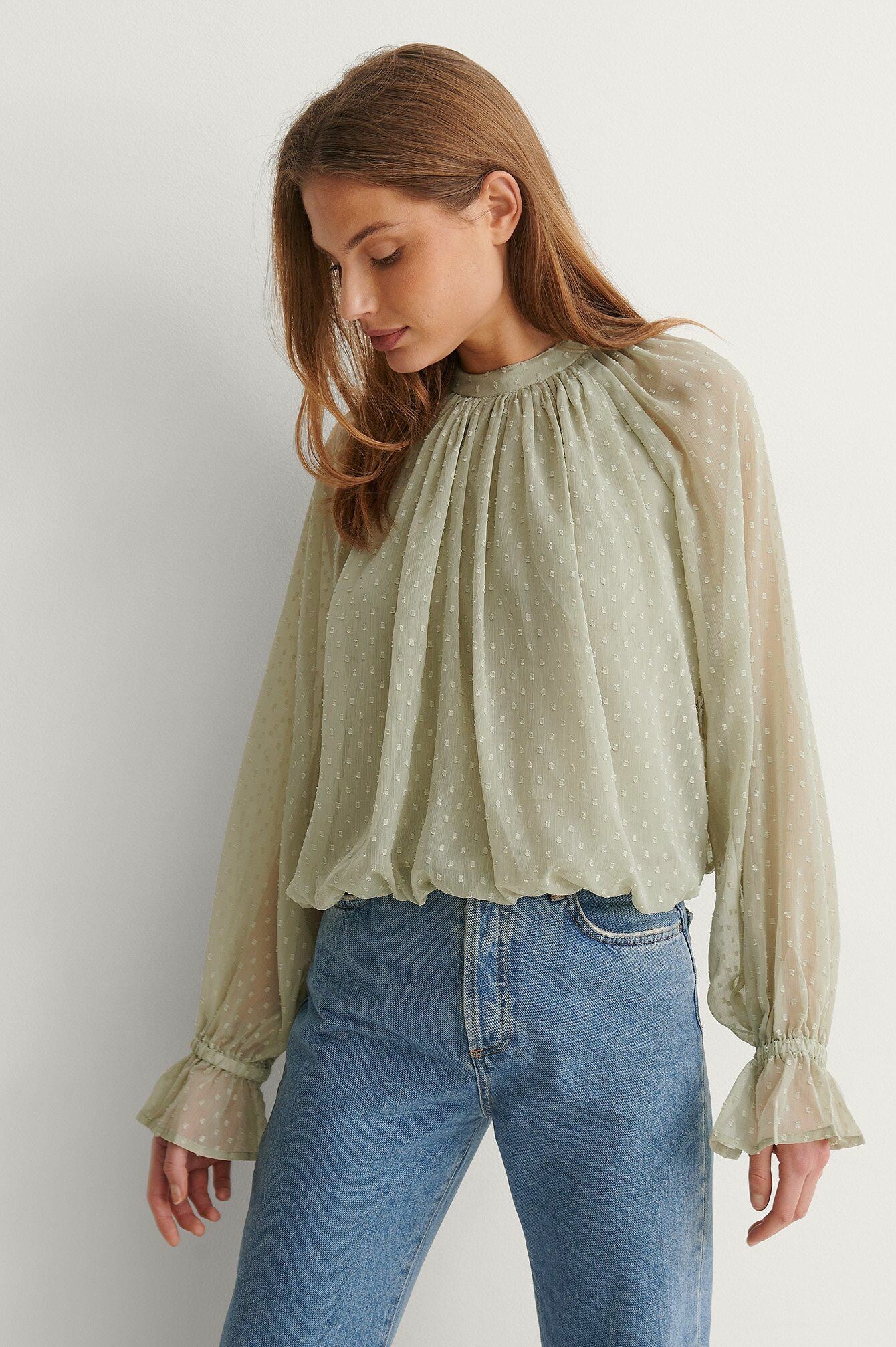 This blouse features a round neckline with 2 button closures at the back, balloon sleeves with elastic cuffs, half underlining, a material with a bobby pin and a volume design.