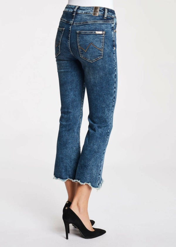 Five-pockets jeans in stretch cotton denim with asymmetrical raw cut hem and used-effect wash. Featuring a relaxed fit with a high waist, wide leg and ankle length. With logo patch and concealed zip and button fastening.