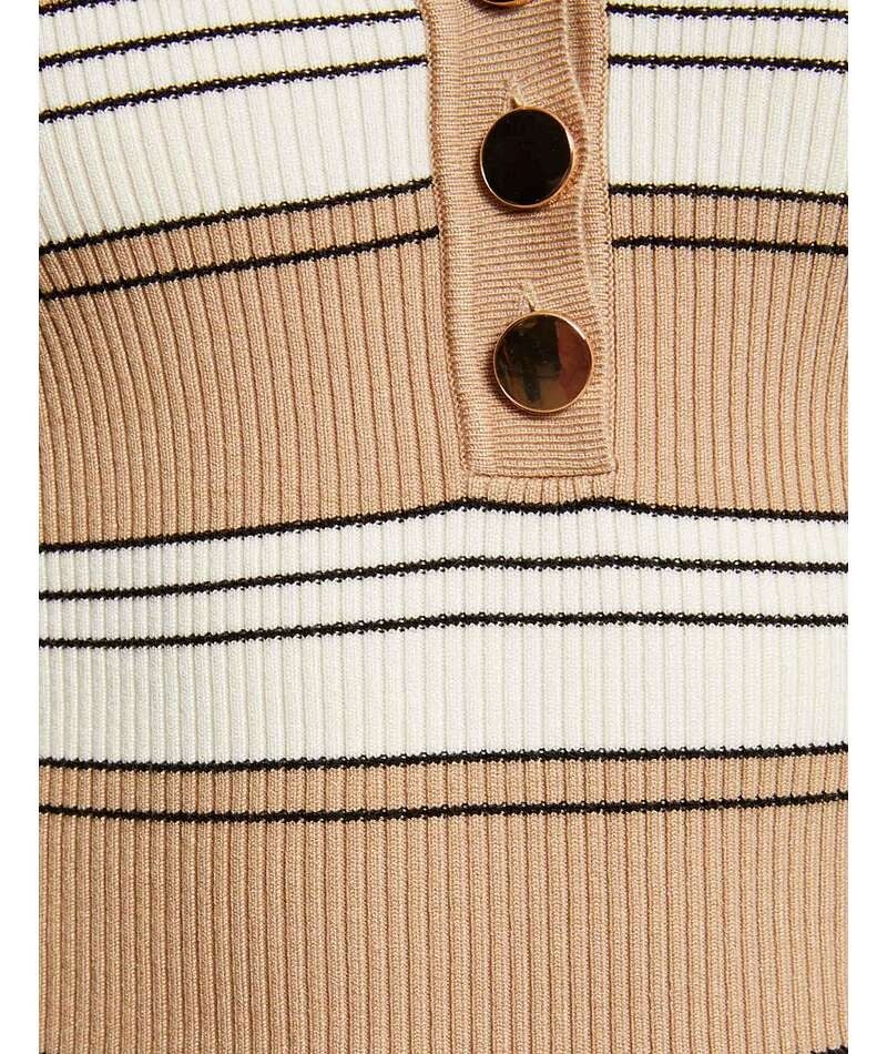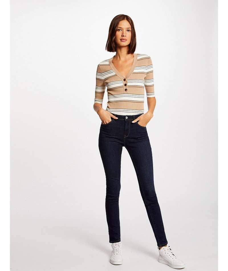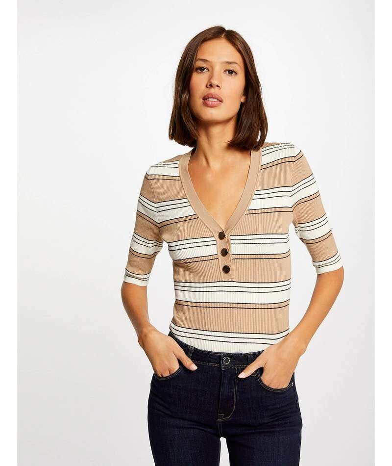 - PULL KORTE MOUWEN GESTREEPT, AANSLUITENDE SNIT, V-HALS, KORTE MOUWEN, KNOOPSLUITING AAN DE VOORKANT, FIJNGEBREID, RIBGEBREID, HORIZONTALE STREPEN, HET MODEL IS 1,75 M LANG EN DRAAGT MAAT S/36, MAATADVIES: KIES UW GEBRUIKELIJKE MAAT